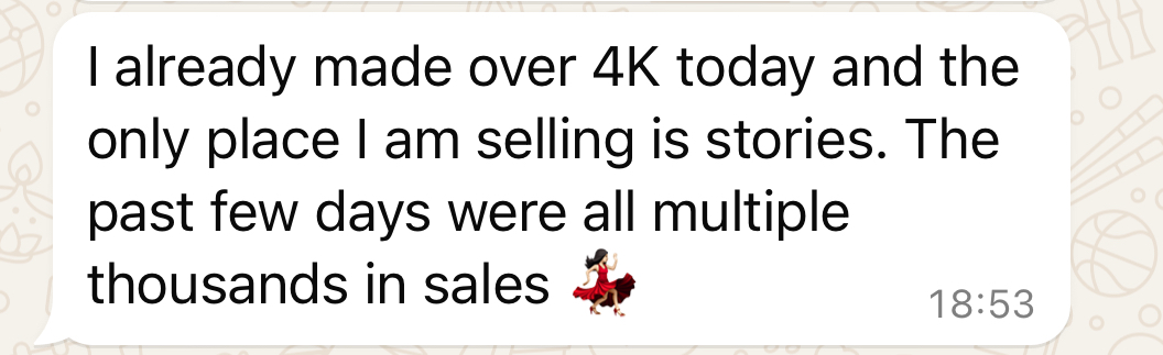 My Stories That Sell Daily Method to uncover the real reason your stories aren’t selling as much as $1M worth - this one fix alone has helped clients go from $0 to $10k in a week. (yes this is for you if you already sell from stories but haven’t yet made $1M from them yet)